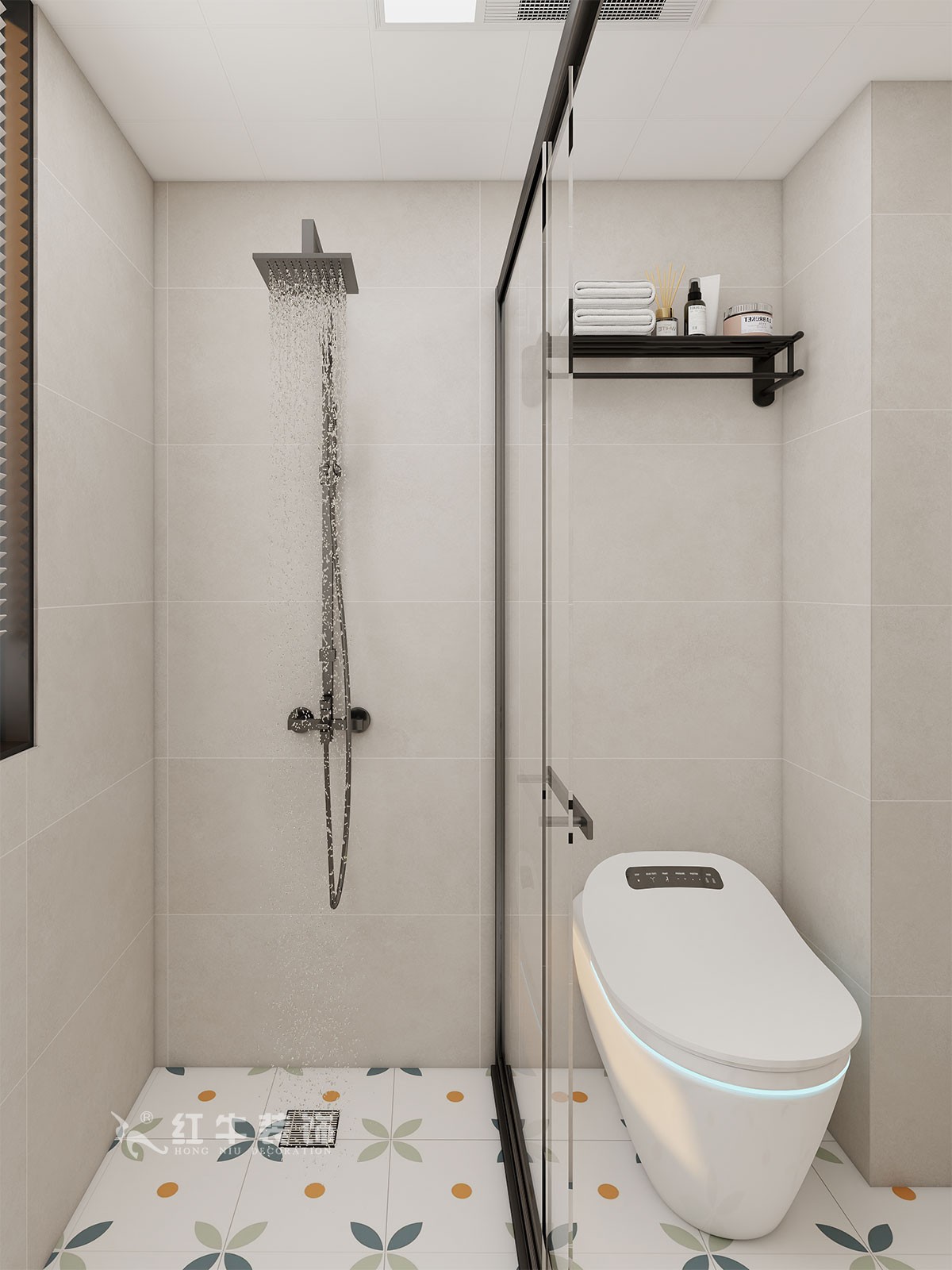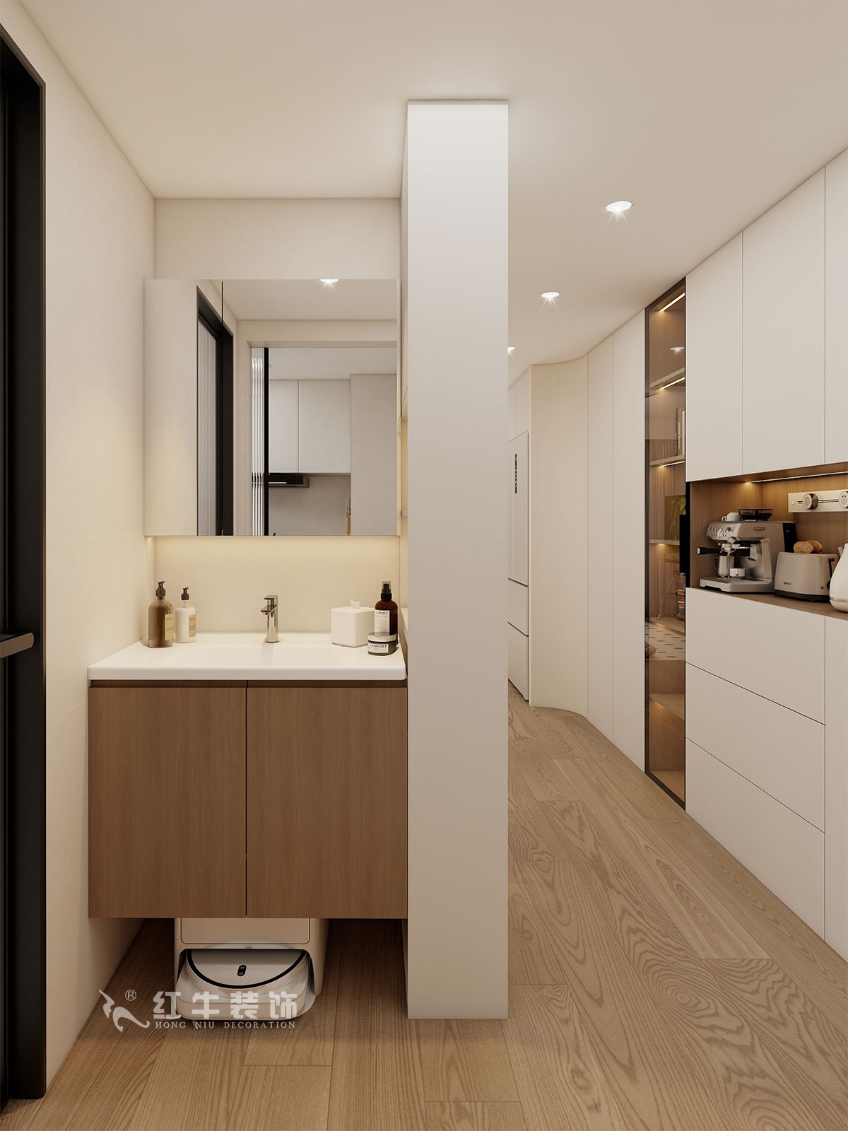 衛(wèi)生間說明:干區(qū)選擇整體色彩搭配干凈、大方,選擇大尺寸米色瓷磚上墻,氛圍感溫馨感滿滿。