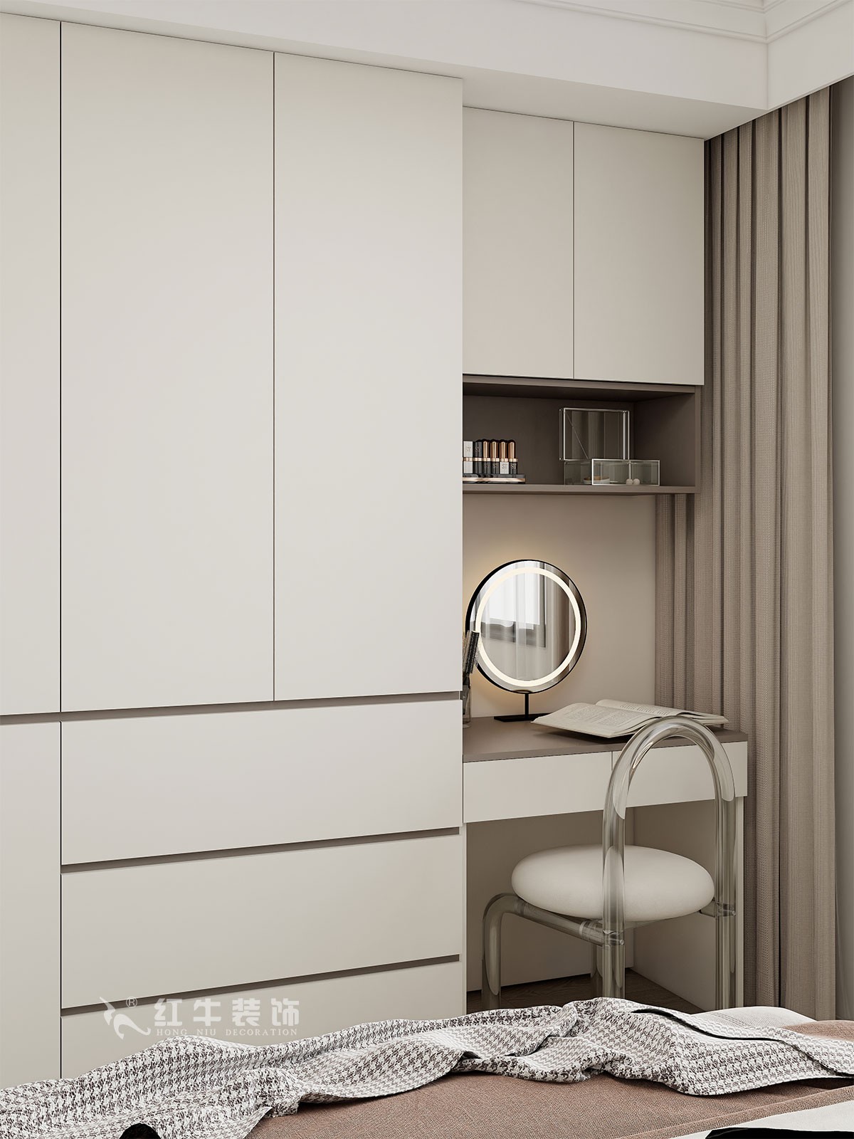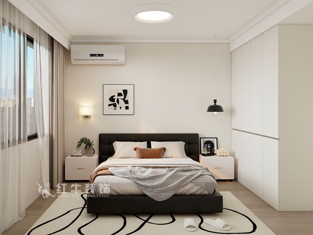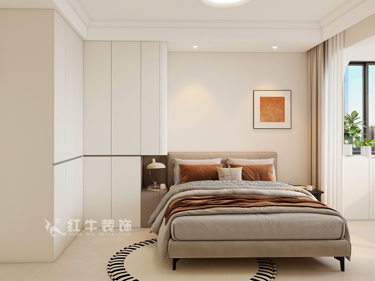 臥室說明:搭配大面積的白色定制衣柜,床頭的光源以不同形勢呈現(xiàn),既滿足不同燈光需求,又恰到好處地起到了裝飾效果,使整體臥室空間呈現(xiàn)明亮、溫柔的舒適狀態(tài)。