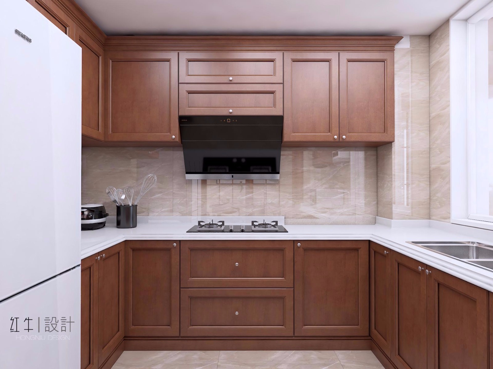 廚房是U字形,空間整體感強(qiáng),功能區(qū)分合理,做起飯來方便。