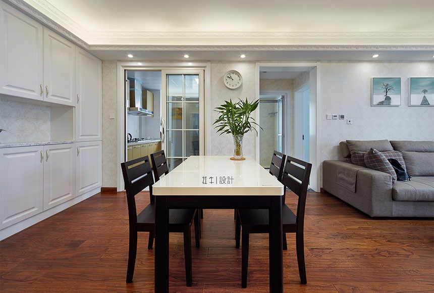 從全面考慮,客廳明亮但不刺眼的光線,使整個空間柔和,干凈,像塊安靜美麗的湖泊。餐廳木頭樸素溫潤的質(zhì)地總是讓人感覺到微暖,身邊有了木頭,就有了身在大自然的親切舒適感。