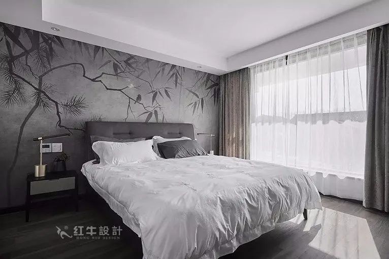 家具造型以簡(jiǎn)潔的線條為主,背景墻是極具東方韻味的竹葉墻布,嚴(yán)整的格局和平和的調(diào)性渾然一體,契合中國傳統(tǒng)文藝崇尚的中和雅正之美。