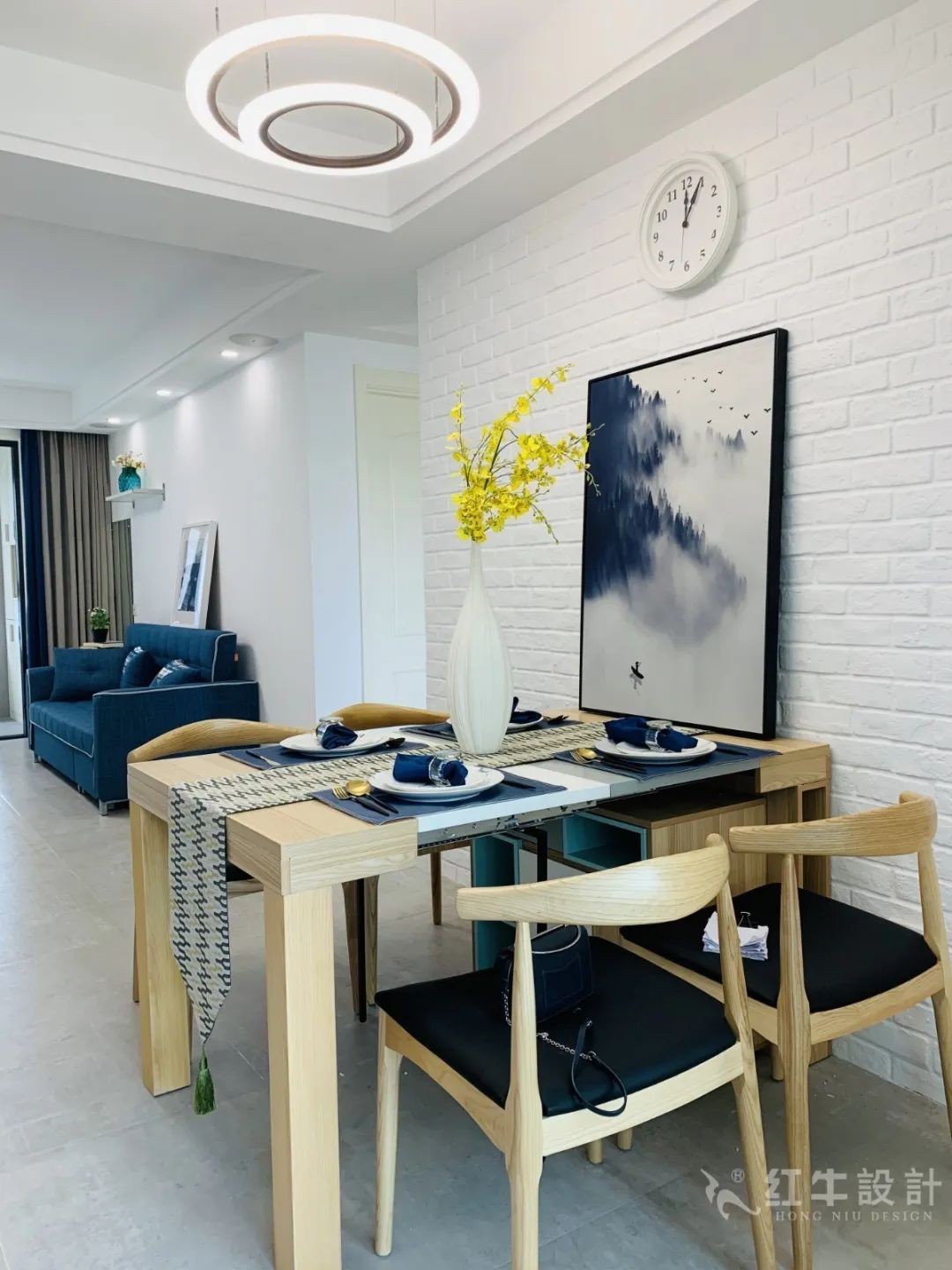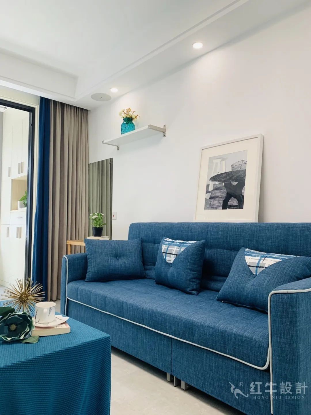深藍(lán)色的布藝沙發(fā)特別吸晴,豐富了整個空間的配色。