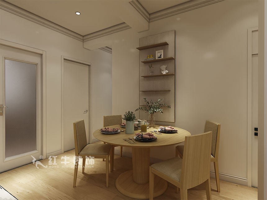 圓桌更加親密浪漫,用餐人可以同時(shí)看見(jiàn)其余所有的人,交流更加方便。墻面上裝飾的隔板架,增加了整體區(qū)域的設(shè)計(jì)感。