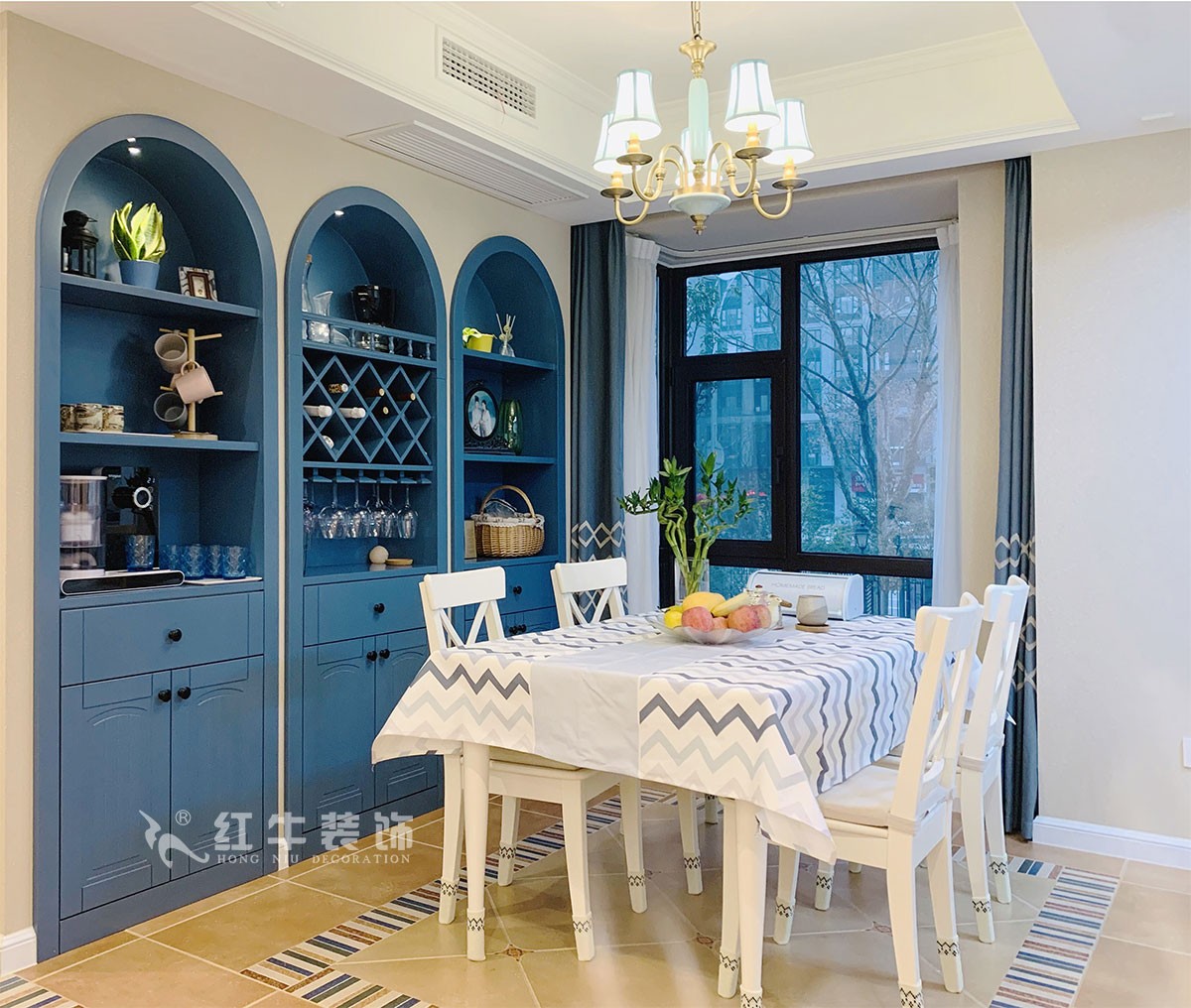 以白色為主色調(diào)的餐廳,顯得尤為純凈雅致,最吸睛的就是藍(lán)色的內(nèi)嵌的置物架,頂部的拱形設(shè)計(jì)就是地中海風(fēng)格的典型特征。