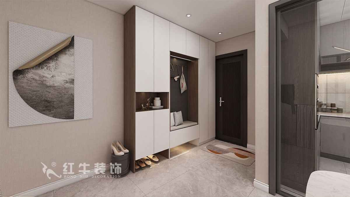入戶墻體處做了一組組合柜既不影響進(jìn)門,又滿足進(jìn)門儲(chǔ)藏開間。
